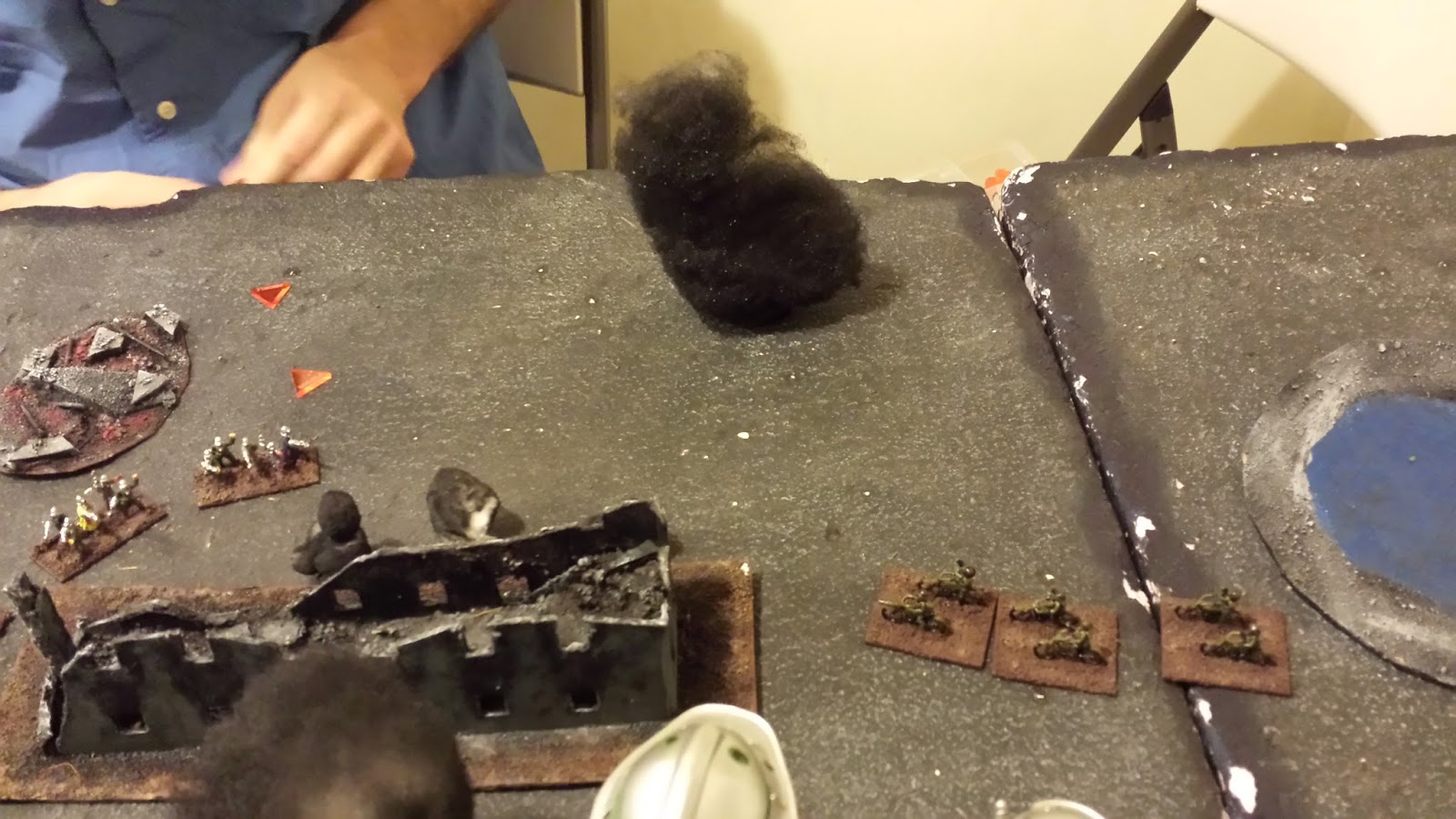 On the Martian turn, Fritz's Machines of Death break through the center of town, congesting the center with towering tripods. However, none of them have dust, and only one has gas, making the various human units (mortars, infantry, commanders and HMGs) in the buildings very hard to kill.