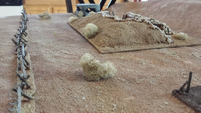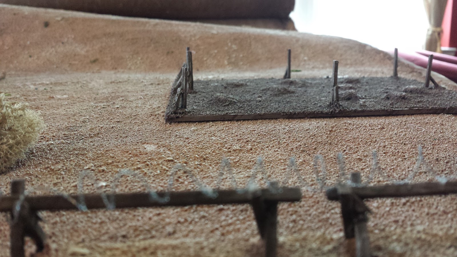The minefield, being intended for WWII, isn't quite finished (I ran out of wire), but it's not my priority at the moment. I kept it in the final shots for completeness. The bumps are just sanded bumps of wood filler.
